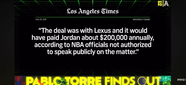 Pablo Torre:“那你怎么解释,在乔守信事件中——这件事刚好也跟你有关——鲍尔默和快船,因为给小乔丹额外的每年20万美元的雷克萨斯代言合同,从而被联盟以‘规避工资帽’规则罚款25万美元?”